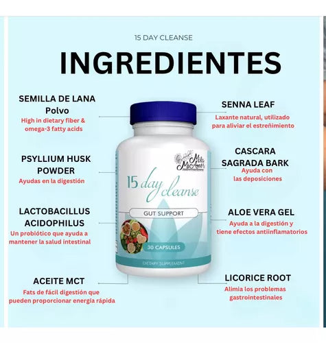 "15 Day Cleanse: Una solución natural y efectiva para revitalizar tu salud digestiva, eliminar toxinas y recuperar tu energía, todo en un programa fácil de seguir y sin efectos secundarios."